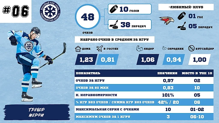 На 6 месте продолжает держаться единственный защитник – Тревор Мерфи. Наверняка он был бы выше, если бы не травмы, ведь по очкам за игру его результат второй! У него все по-прежнему на хорошем уровне, из важных изменений: стал очень сильным перекос в пользу домашних игр, но выровнялись результаты по типам соперника, раньше гораздо больше очков набиралось с «аутсайдерами».
