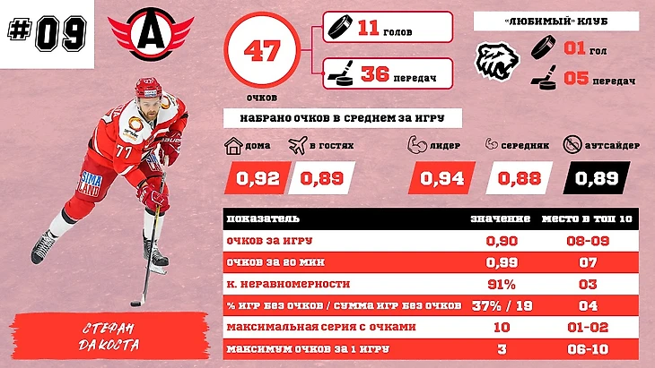 На 9 месте расположился Стефан Да Коста – предыдущий лидер. Не удержал темп, снизил результативность почти по всем показателям. На хорошем уровне остался только коэффициент неравномерности, но это говорит лишь о том, что очки он дальше продолжит набирать с похожим темпом (точнее мы с большей долей уверенности можем предположить такой исход). Думаю, все болельщики Автомобилиста рассчитывают на то, что этот спад обоснован и пик формы их лидера придется именно на плей-офф.