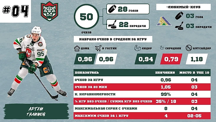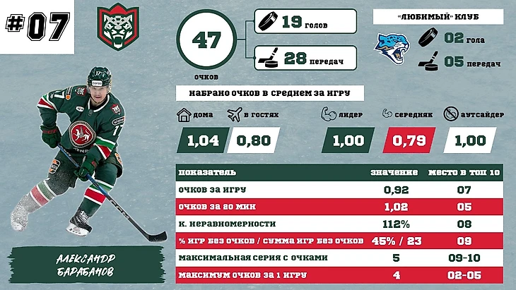 Ак Барс улучшил свои результаты во второй половине сезона и целых 2 его игрока оказались в ТОП-10. На 7 месте – Александр Барабанов. Идет неплохо, у него все достаточно ровно, без сильных перекосов (немного выделяется набор очков дома и проседают результаты с «середняками»). Почти по всем показателям он в нижней половине ТОПа и маловероятно, что поднимется существенно выше, хотя игр еще много и шансы есть.