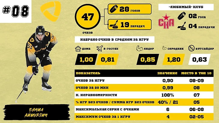 Далее главный прорыв – в прошлый материал Аймурзина включал только «по блату», а сейчас он занял полноценное и заслуженное 8 место. После 34 игр команды у него было 25 очков, но за 19 предыдущих игр он набрал еще почти столько же – 22. В противоположность Да Косте Данил улучшил почти все показатели. Ключевой прирост – игра против лидеров (с 0,29 очка за игру до 0,85). Если темп последних игр продолжится – должен подняться еще выше.