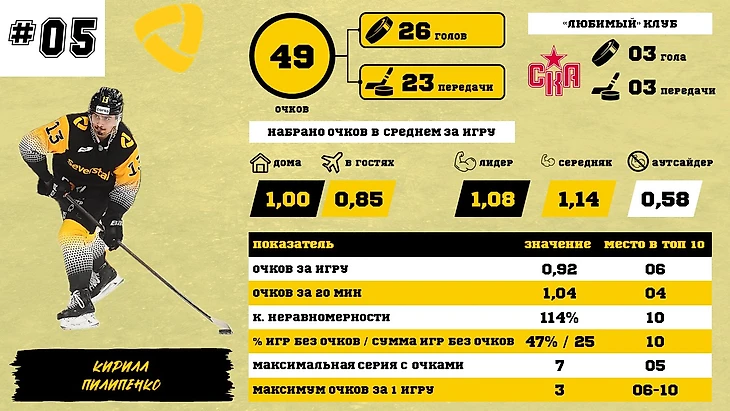 Переходим к ТОП-5. Замыкает пятерку Кирилл Пилипенко. Несмотря на улучшение позиций (Поднялся с 10 места), играет он очень неровно: почти половина игр вообще без набранных очков! Основной рост – игра против лидеров (добавил 0,37 очка за игру). Главный потенциал к улучшению – игра против аутсайдеров, если с ними очки будут набираться на том же уровне, что и с остальными – будет шикарная прибавка к результативности.