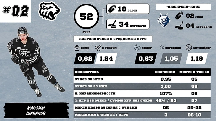На втором месте – Максим Шабанов. Я в него не верил, а он уверенно набирает очки и крепко держится на втором месте. Молодец, что тут еще сказать. Основной потенциал для роста – игра дома и игра с лидерами. Оба показателя ухудшились во второй половине чемпионата. Максим вообще единственный из всего ТОПа бомбардиров, у кого так сильно проседает набор очков дома: то ли груз ответственности при болельщиках давит сильнее, то ли просто не фартит.