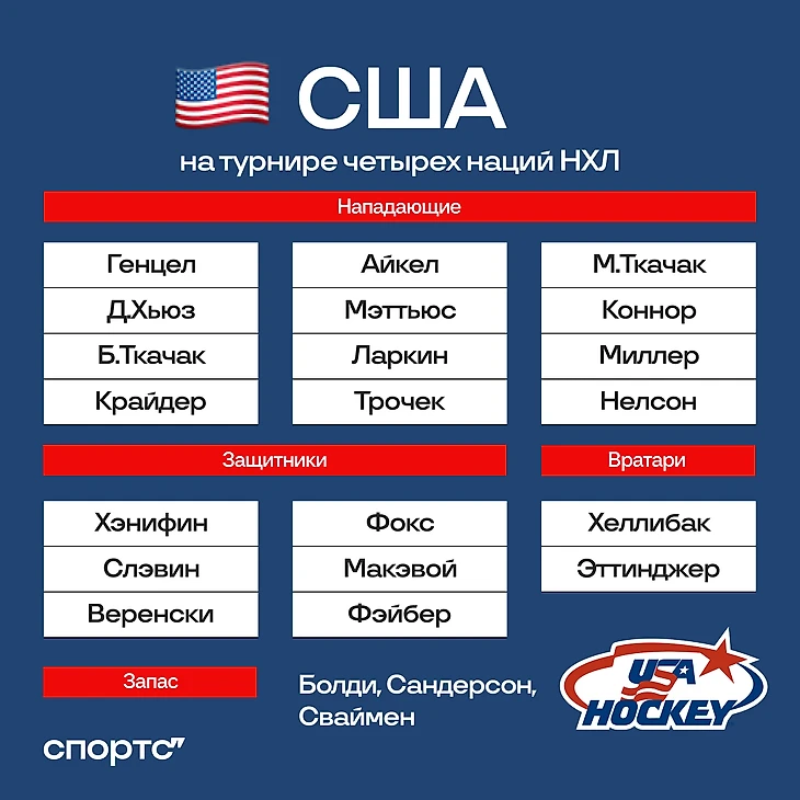 Кросби доехал до сборной, США без Хьюза-старшего, три замены у финнов. Итоговые составы на Турнир 4 наций