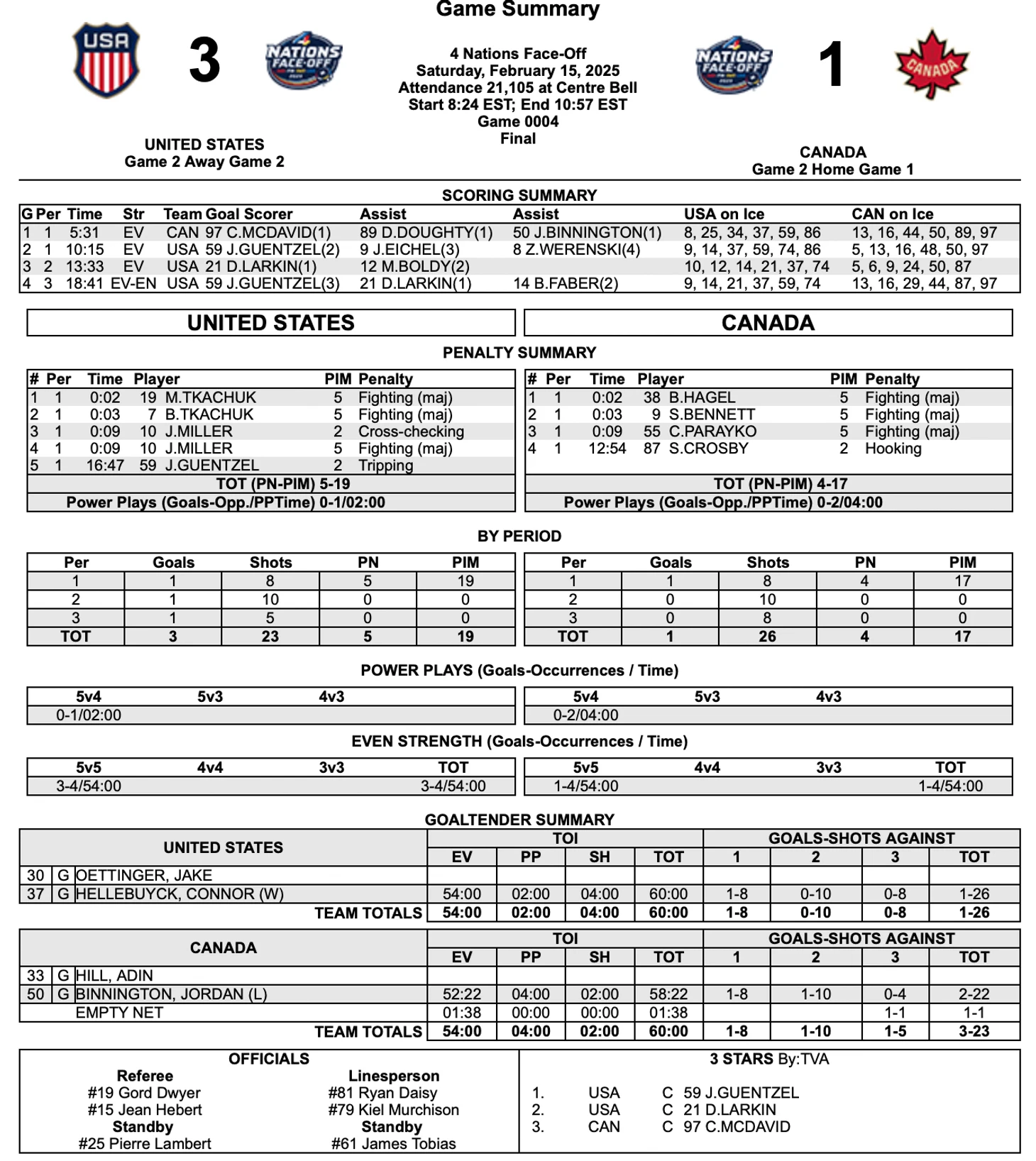Насели канадцы на ворота «звездно-полосатых» в заключительной трети. Где-то здорово подтащил Коннор Хеллебайк, где-то помогли защитники. Долгое время в атаке не превратилось в заброшенную шайбу, а последнее слово осталось за американцами. Джейк Гюнцель поразил пустые ворота, оформил дубль и досрочно вывел свою сборную в финал Турнира четырех наций.