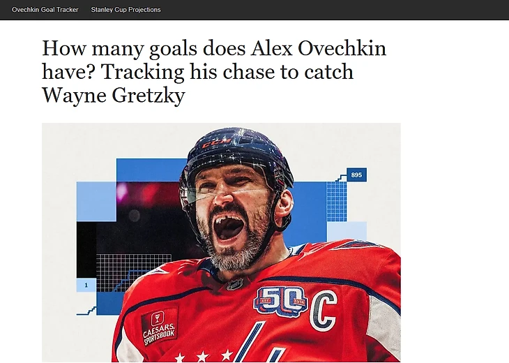 Ну и конечно, нельзя не упомянуть Александра Овечкина и его погоню за рекордом Уэйна Гретцки. Событие, эпохальность которого отмечают и освещающие НХЛ зарубежные авторитетные медиа. К примеру, тот же The Athletic ведёт отсчёт забитых Ови шайб до рекорда.