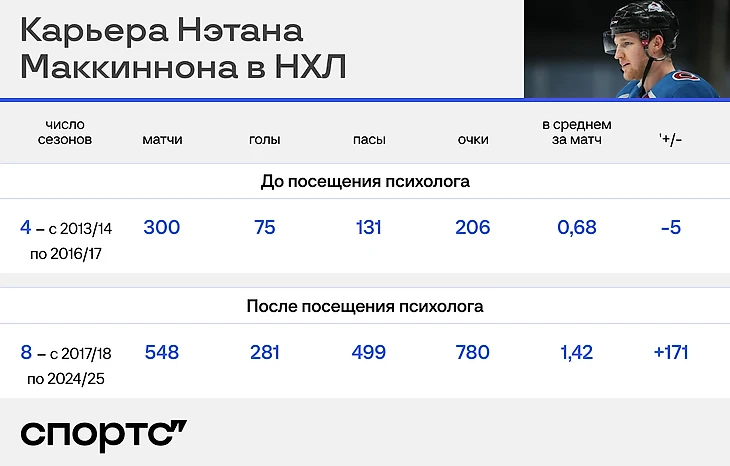Когда Маккиннон рассказал о работе со спортивным психологом, он немного изменил отношение окружающих к этому все еще частично табуированному вопросу. Глядя на его результаты после обращения к специалисту, некоторые игроки увидели в этом не слабость, а возможность для роста.