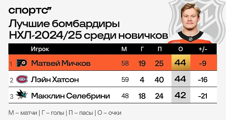 Благодаря такому мощному отрезку Мичков вышел на первое место в списке бомбардиров среди новичков. У Матвея 44 очка – Лэйн Хатсон из «Монреаля» набрал столько же, но у защитника на одну игру больше. Макклин Селебрини на третьей позиции, но по очкам за матч он опережает и Мичкова, и Хатсона.
