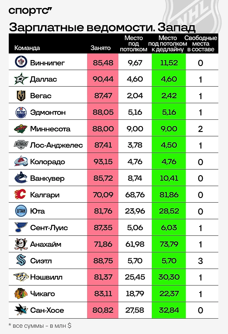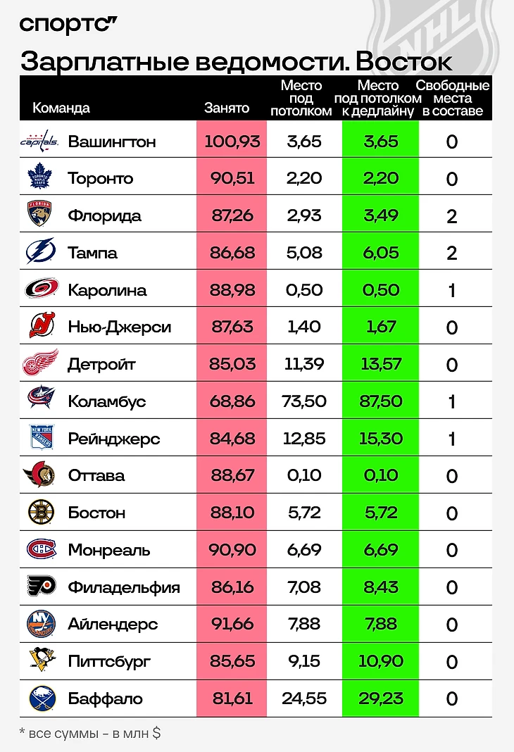 Главные показатели в таблицах ниже – две колонки: место под потолком к дедлайну и количество свободных мест в составе. Первая цифра показывает, какую совокупную зарплату могут иметь потенциальные новички. Второе значение отражает, соответственно, количество этих возможных игроков. Если команде захочется добавить больше хоккеистов, чем есть свободных мест – придется спускать кого-то из основы в фарм-клуб, отправлять на драфт отказов или обменивать. Клубы разделены на две группы по конференциям и расставлены по местам в таблице, которые они занимали по состоянию на 27 февраля. Суммы зафиксированы на ту же дату.
