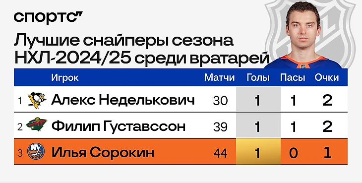 Но Илья забил. Счет – на табло, а гол – в протоколе. По факту Илья Сорокин – 17-й вратарь в истории НХЛ, который забросил шайбу. Из них он шестой европейский и второй русский – первым был Евгений Набоков. Правда, тот забил прямым броском: 10 марта 2002-го кипер «Сан-Хосе» поразил ворота «Ванкувера».