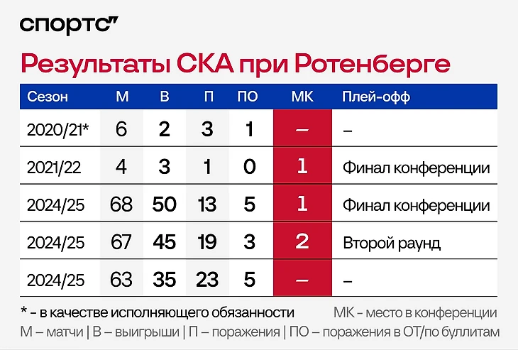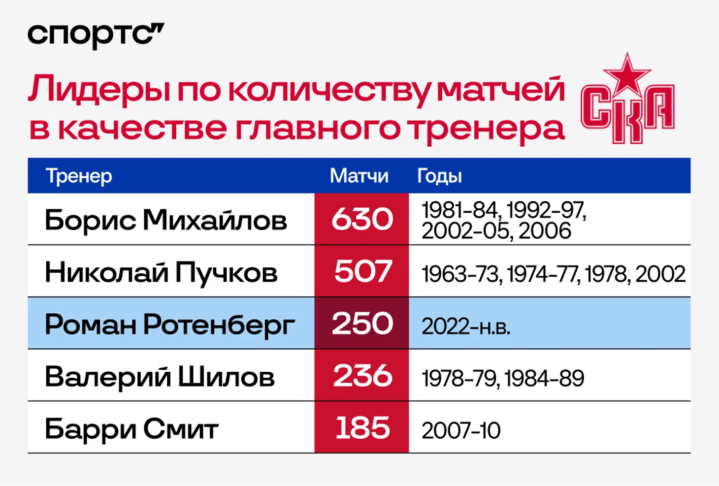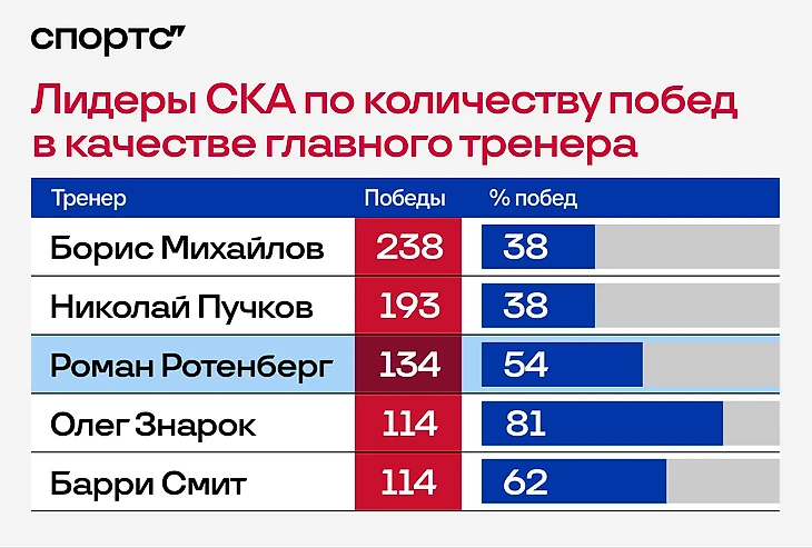 Ротенберг входит в тройку лучших тренеров СКА – по матчам и победам