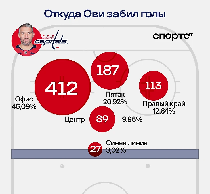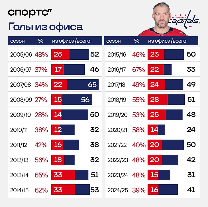 Вот здесь интересно. Как думаете, сколько голов Овечкин забил именно из офиса, а сколько – откуда угодно, но не из офиса? Насколько миф оправдан статистикой и насколько этот шаблон про «Офис Овечкина» жизнеспособен?