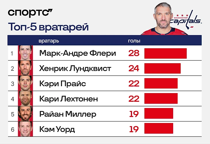 В Вашингтоне соответственно 10 игроков забили 21 шайбу.