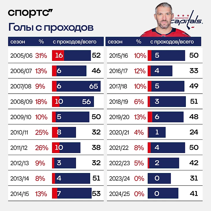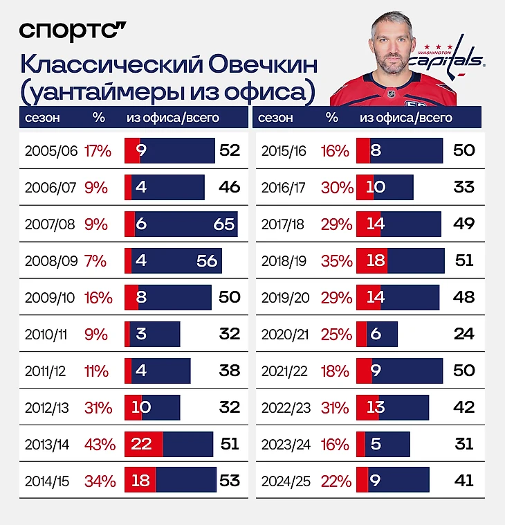 Классический гол Овечкина – уантаймер из офиса – знают даже дети. Динамика изменения процента таких голов покажет, в какие годы Ови был наиболее опасным в классическом для себя смысле.