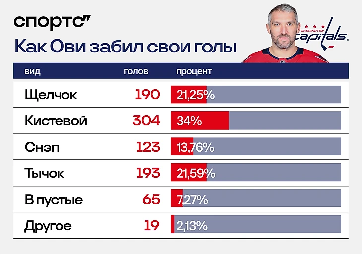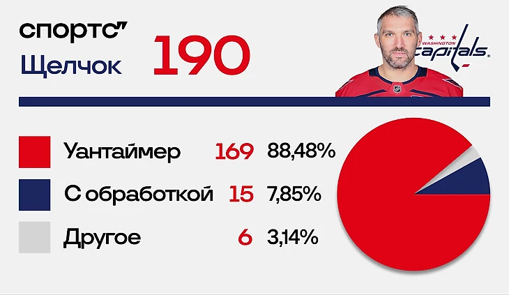 Вопреки мощной картинке, которая встает перед глазами, когда произносишь сочетание «Гол Овечкина» с щелчком в девятку, преобладает, конечно, кистевой.