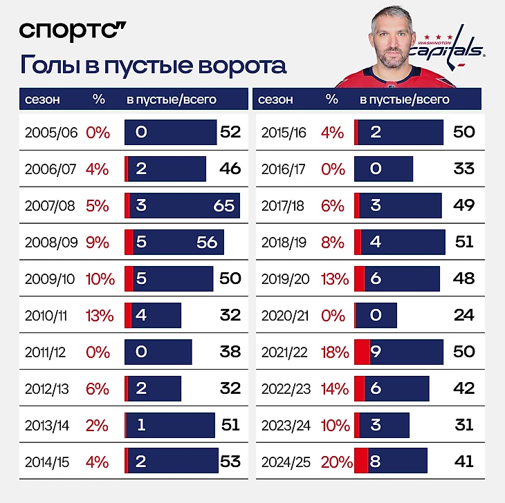 Голы в пустые ворота мы тут не учитывали и отнесли их в отдельную корзину – вряд ли есть разница, каким броском Овечкин попал по воротам, в которых никого нет.