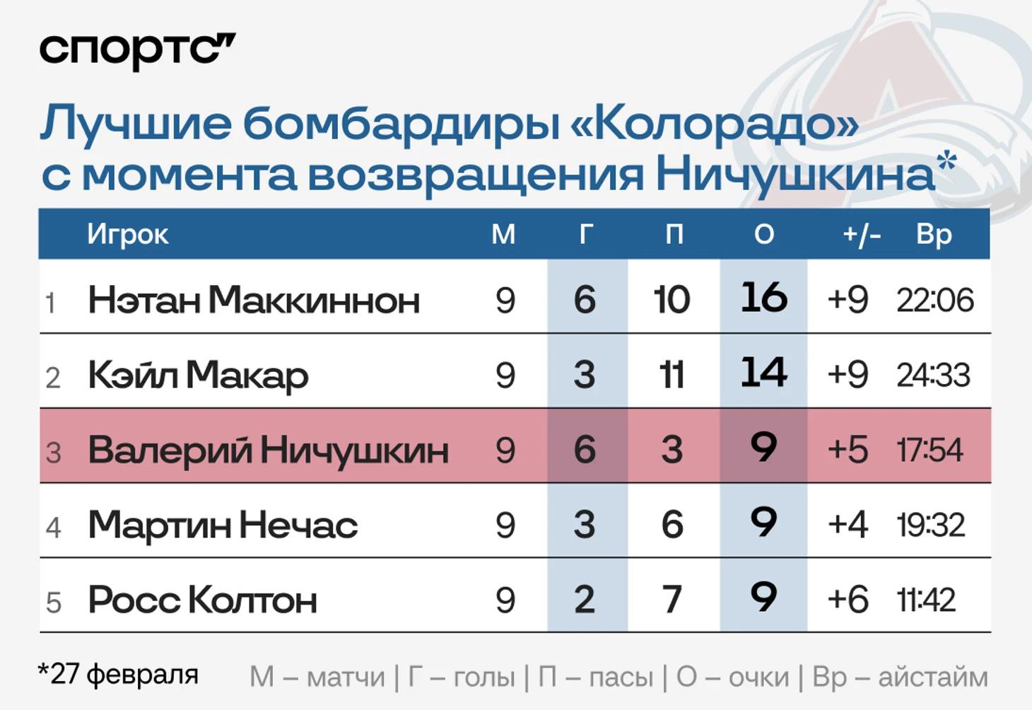 Ничушкин набрал отличный ход после возвращения 27 февраля: выбил 6+3 в 9 матчах. На этом отрезке он забросил столько же, сколько и Маккиннон.