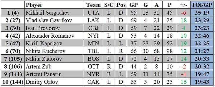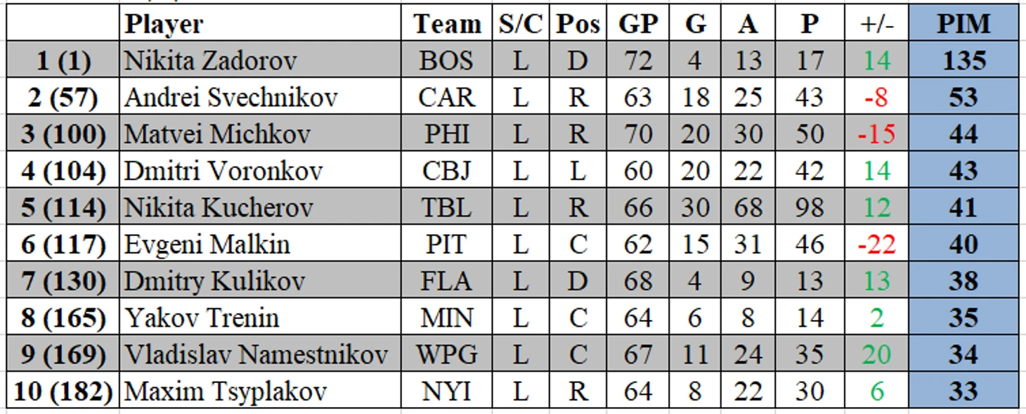 Худшие по показателю полезности среди россиян: Евгений Малкин «-22» (62 матча, среднее игровое время 17:54); Владимир Тарасенко «-17» (67 матчей, среднее игровое время 14:53); Матвей Мичков «-15» (70 матчей, среднее игровое время 16:19); Федор Свечков «-12» (40 матчей, среднее игровое время 12:26); Егор Замула «-12» (53 матча, среднее игровое время 16:29).
