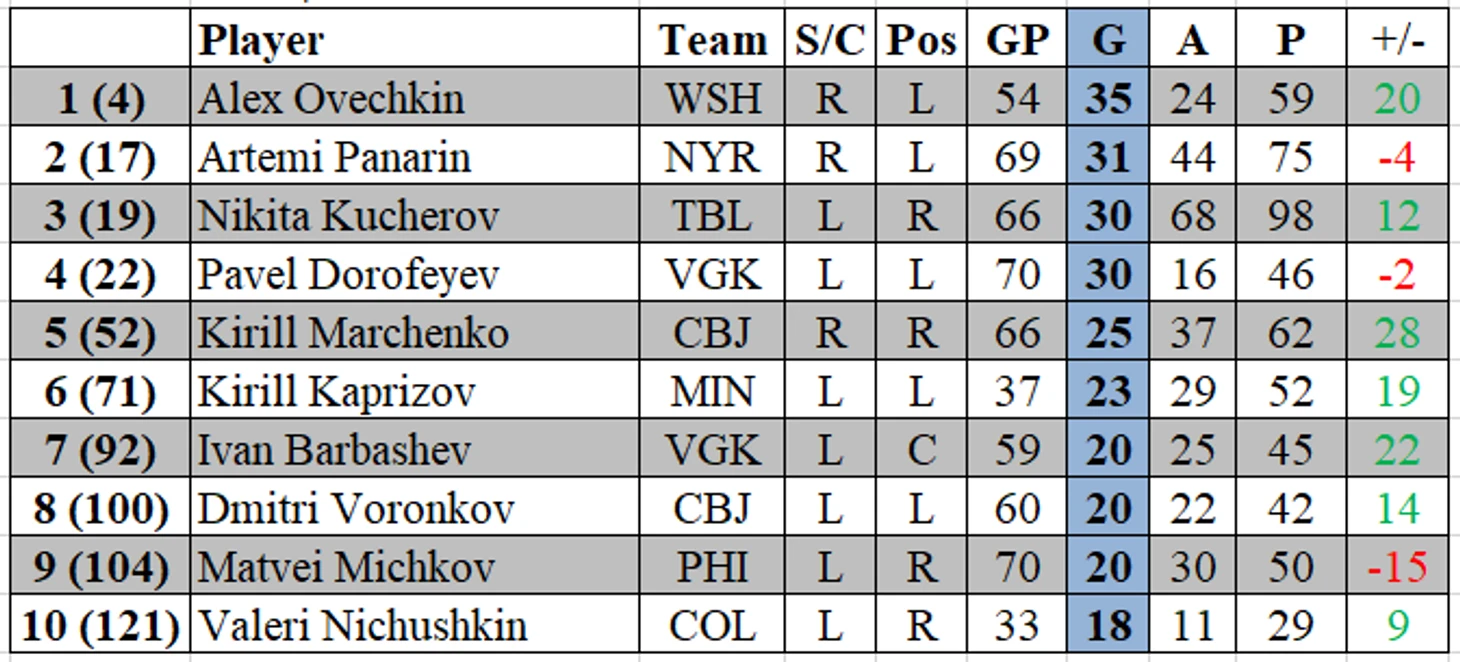 Александр Овечкин продолжает лидировать в снайперской гонке среди россиян, на его счету 35 заброшенных шайб в 54 матчах. Вторым идет Артемий Панарин с 31 голом в 69 матчах. Третье место делят Никита Кучеров и Павел Дорофеев, на счету которых по 30 голов.