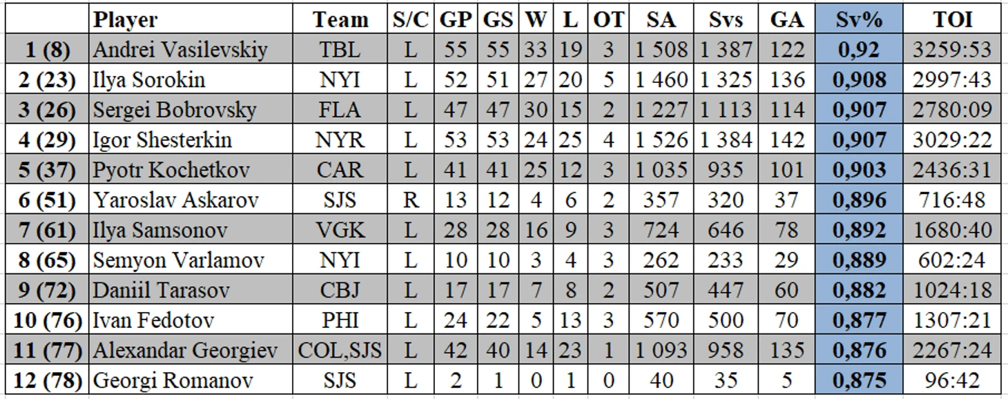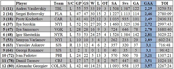 По коэффициенту надежности первое место среди наших вратарей также занимает Андрей Василевский с 2.25. Вторым идет Сергей Бобровский с 2.46, третью строчку занимает Петр Кочетков с 2.49.