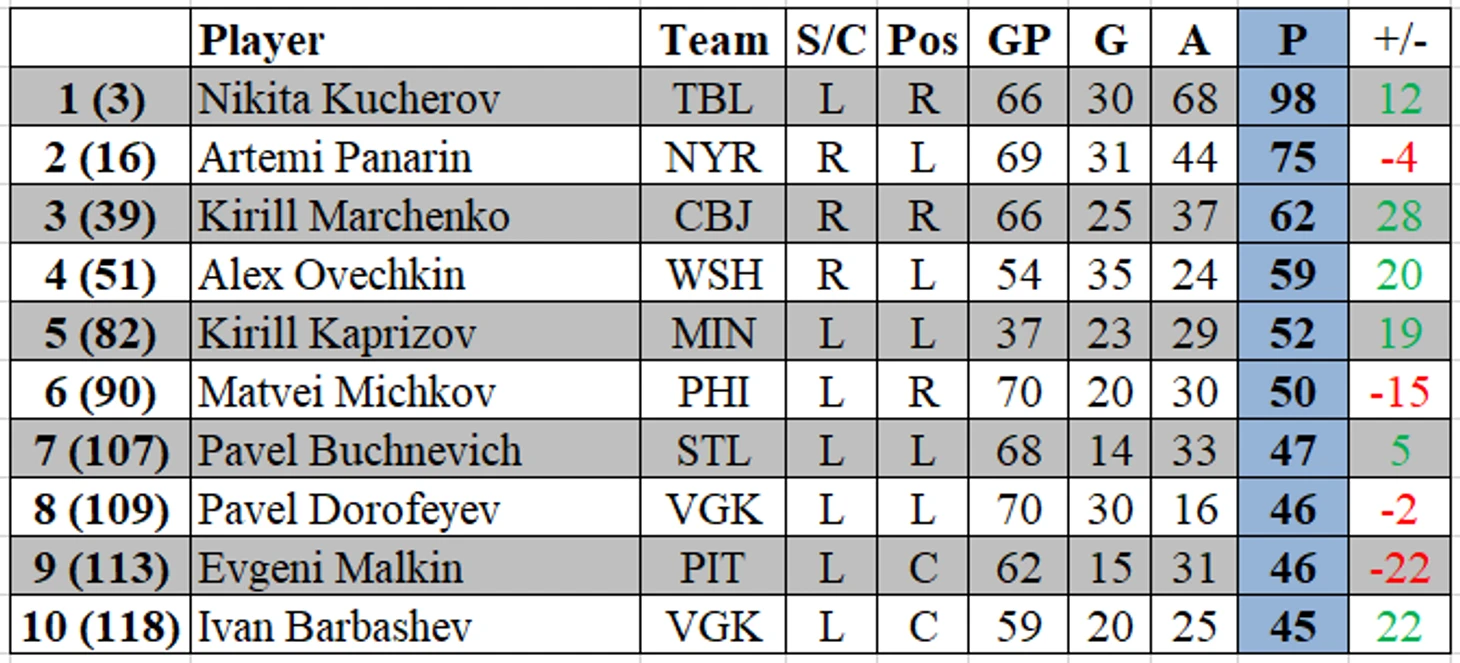 Никита Кучеров с большим отрывом лидирует среди бомбардиров среди российских игроков, на его счету уже 98 (30+68) очков в 66 матчах. Тройка лидеров среди наших форвардов не меняется на протяжении нескольких недель, после Кучерова идут Артемий Панарин (75 очков в 69 матчах) и Кирилл Марченко (62 очка в 66 матчах).