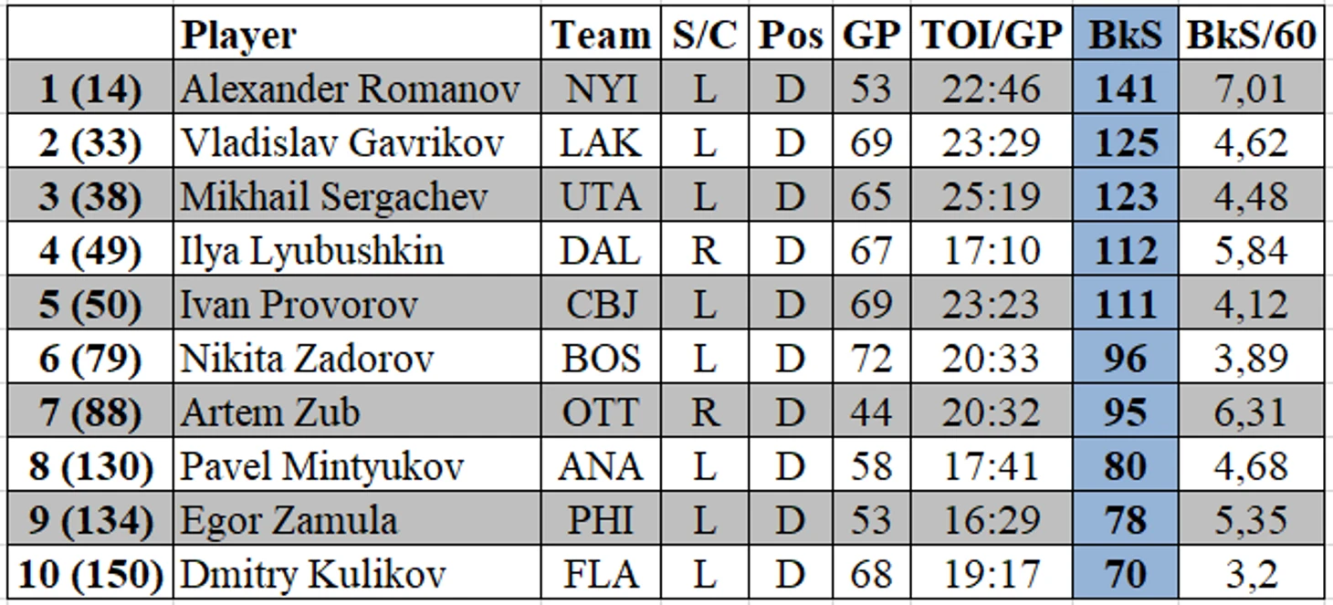 Защитник «Нью-Йорк Айлендерс» Александр Романов продолжает лидировать по количеству заблокированных бросков, в его активе 141 блок в 53 матчах. На второе место вышел Владислав Гавриков, который заблокировал 125 бросков в 69 матчах. Третью строчку занимает Михаил Сергачев с 123 заблокированными бросками в 65 матчах.