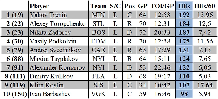 Яков Тренин добавил еще 11 силовых приемов за прошедшую неделю и уверенно лидирует среди наших хоккеистов по данному показателю. Вторую строчку занимает Алексей Торопченко с 184 хитами в 70 матчах. На третьей строчке располагается защитник «Бостона» Никита Задоров, который уже сделал 183 силовых приема в 72 матчах.