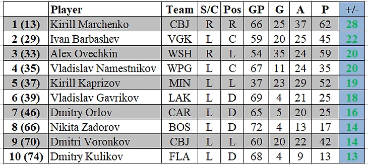 Кирилл Марченко уверенно лидирует с «+28» среди российских игроков в НХЛ. На второе место поднялся Иван Барбашев, у которого «+22» после 59 матчей. Третью строчку делят Александр Овечкин и Владислав Наместников, у обоих форвардов по «+20».