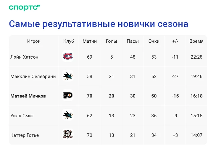 Мичков подтянулся к лидерам бомбардирской гонки новичков. Все еще лидирует Лэйн Хатсон из «Монреаля», хотя и оторвался всего на три очка. Но он защитник, который действительно уже определяет игру своей команды – кажется, даже если Матвей к концу сезона прибавит, то «Колдер» не возьмет.