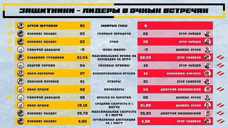 В большинстве показателей (7 из 12) лидируют защитники Спартака: наиболее сильное преимущество в «плюс-минус», количестве силовых приемов и блокированных бросков. Северсталь же явно обгоняет по перехватам и точным передачам.