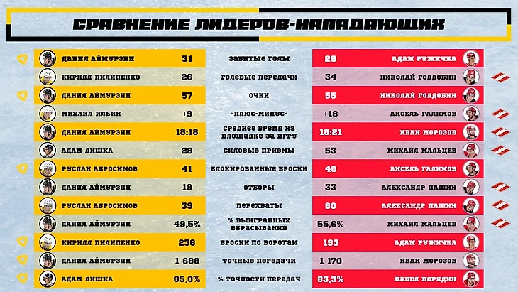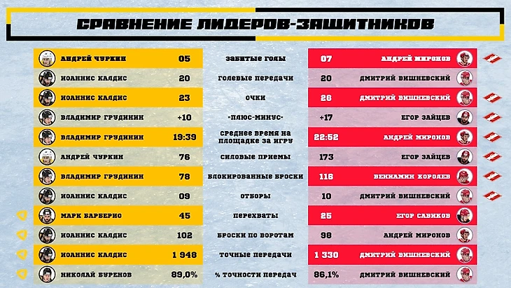 В сравнении лидеров среди защитников и нападающих по каждому из статистических показателей