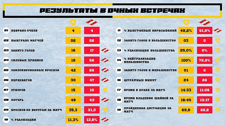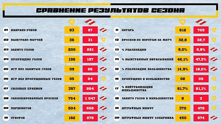 Итак, если посмотреть на виртуальные баллы – Спартак выиграл 4-2 (или 59-41 если суммировать все «эмблемы» в таблицах – то есть победы в показателях), но все мы понимаем, что это практически ничего не значит: в плей-офф команды показывают другой хоккей и невозможно предсказать, что из преимуществ даст результат, какие минусы получиться нивелировать самоотдачей и везением.