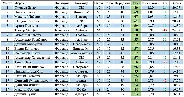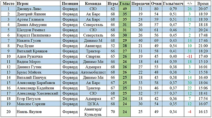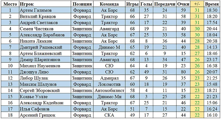 Для справки среди защитников лучшим снайпером стал Семен Чистяков, защитник «Авангарда» забросил 19 шайб за 68 матчей. Вторым стал Александр Никишин с 17 голами, третье место у защитника «Трактора» Григория Дронова (14 голов за 60 матчей).