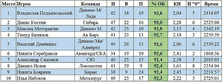 По проценту отраженных бросков лучшим вратарем сезона стал Владислав Подъяпольский, у которого процент отраженных бросков составил 93.8%. Вторую строчку занял вратарь «Сибири» Денис Костин (93.0%), который значительно улучшил свои прошлогодние показатели. На третьем месте расположился Максим Моторыгин – 92.8%.