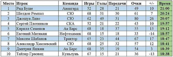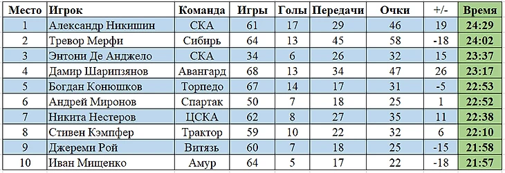 Лидером по игровому времени среди нападающих стал форвард «Авангарда» Рид Буше (21:00). Второе и третье место заняли легионеры «Салават Юлаев»: Шелдон Ремпал (20:24) и Джошуа Ливо (20:07). В первой десятке больше всего представителей уфимской команды.