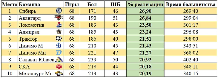 «Сибирь» по проценту первая, но по абсолютному показателю не входит даже в тройку. Больше голов в большинстве забросили «Авангард» (51), «Салават Юлаев» (50) и «Динамо Мн» (47).