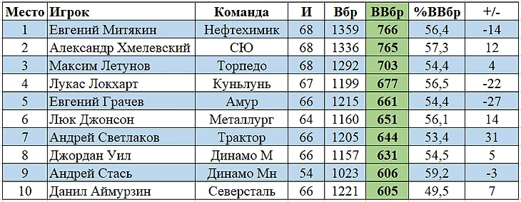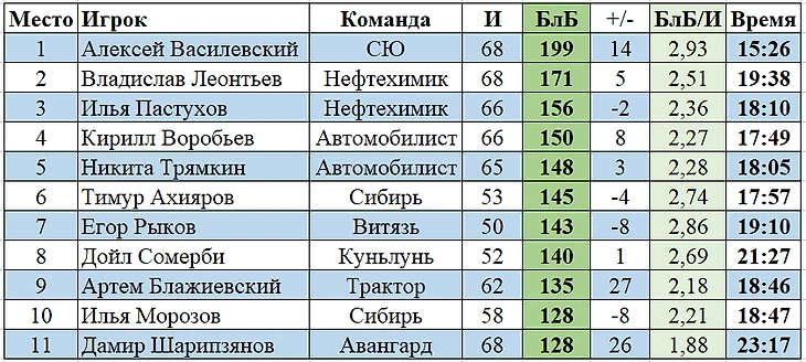 Лучшими по показателю полезности стали трое нападающих: Артем Галимов («Ак Барс»), Виталий Кравцов («Трактор») и Андрей Светлаков («Трактор»), у каждого из этих форвардов полезность составила «+31».