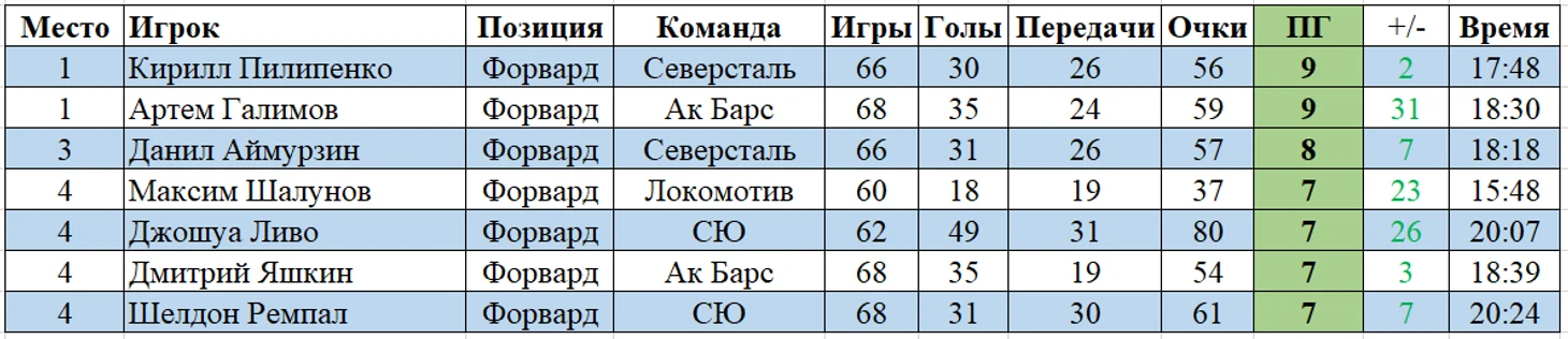 По победным шайбам лучшими стали Кирилл Пилипенко («Северсталь») и Артем Галимов («Ак Барс»), которые забросили по 9 победных голов. Форвард «Северстали» Данил Аймурзин забросил 8 голов, которые принесли победу команде.