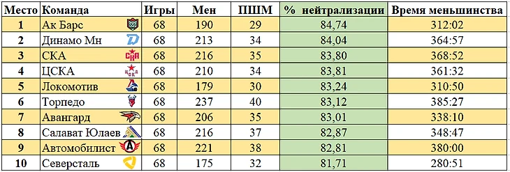 Лучшими по нейтрализации большинства соперника стали игроки казанского «Ак Барса», которые пропустили 29 шайб при 190 попытках (84.74% нейтрализации). Вторую строчку заняло минское «Динамо» (84.04%).
