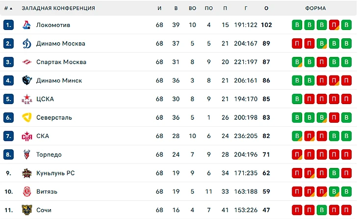 На Западе в плей-офф не попали «Куньлунь», «Витязь» и «Сочи». Сочи были безоговорочно худшими в Западной конференции, они одержали всего 16 побед в основное время за 68 матчей и завершили чемпионат с разницей забитых/пропущенных шайб -73.