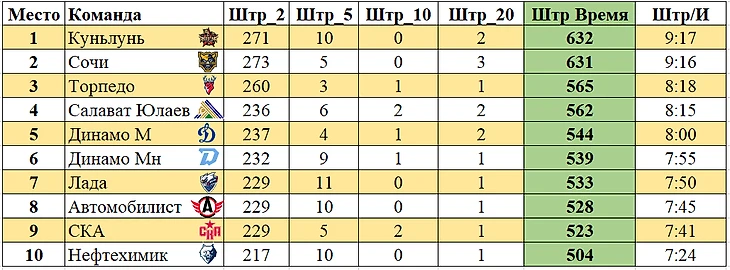 «Куньлунь Ред Стар» стали самой удаляющейся командой сезона, в их пассиве 632 минуты штрафа. Вторую строчку заняли также представители Западной конференции – «Сочи», которые нахватали 631 минуту штрафного времени. Третье место заняли подопечные Игоря Ларионова «Торпедо» с 565 штрафными минутами.