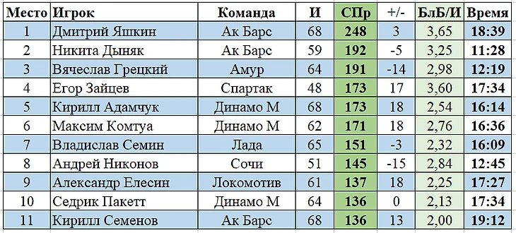 Из 11 лидеров по силовым приемам лишь 4 защитники (Егор Зайцев, Кирилл Адамчук, Владислав Семин и Александр Елесин).