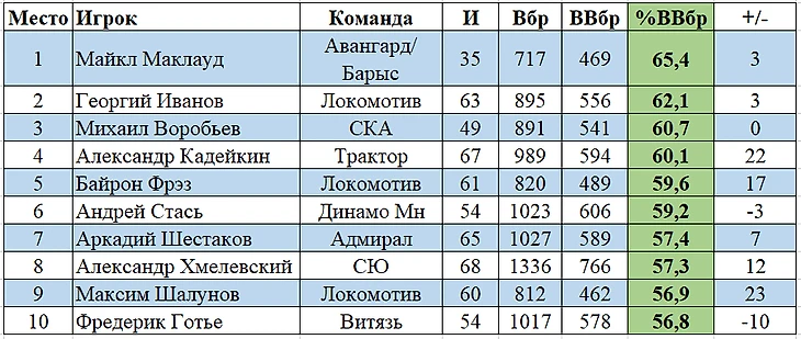 Вторую строчку занял Георгий Иванов («Локомотив») с 62.1%, на третьем месте расположился форвард «СКА» Михаил Воробьев – 60.7% выигранных вбрасывания.
