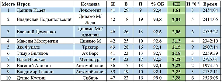 Отмечу, что в таблице приведены вратари, которые сыграли 34 и более матчей (то есть хотя бы половину сезона).