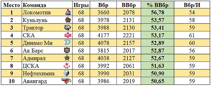 Вторую строчку заняли хоккеисты «Куньлуня» (53.57%), третье место челябинский «Трактор» (53.41%).