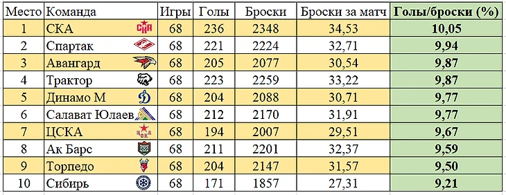 «СКА» стали лидером по броской эффективности, их показатель составляет чуть больше 10%. Они также лидируют по количеству нанесенных бросков. Не сильно от «СКА» отстал московский «Спартак», у которых процент реализации бросков составил 9.94%. Третье место разделили омский «Авангард» и челябинский «Трактор», у обеих команд процент реализации бросков составил 9.87%.