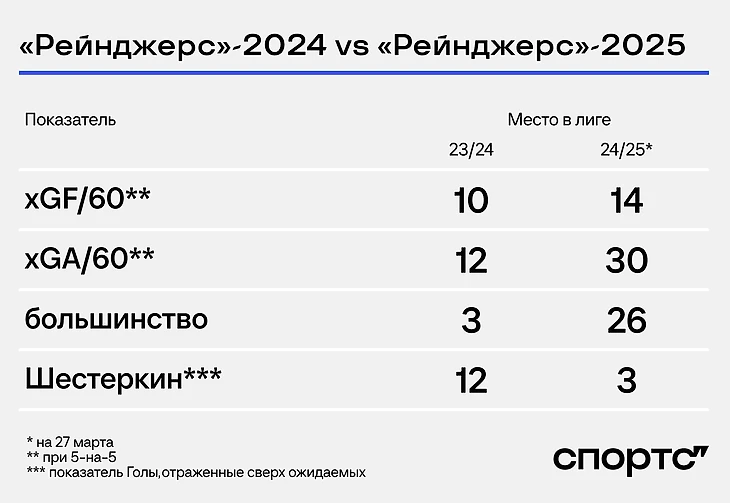Большинство выглядит рядовым фактором, но я думаю, что его влияние на результаты команды не стоит недооценивать. У «Рейнджерс» достаточно игроков, чтобы большинство было хотя бы адекватным (пускай даже не супер), а оно развалилось и приносит на 1-2 гола за матч меньше, чем приносило раньше.