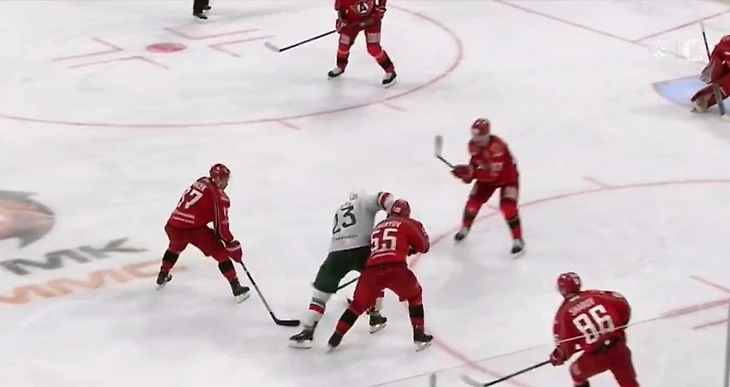 В середине второго периода капитан полез с шайбой на троих игроков «Автомобилиста». Его остановил Семен Кизимов. Удар преимущественно пришелся в лицо Яшкина. Там сразу появилась кровь.