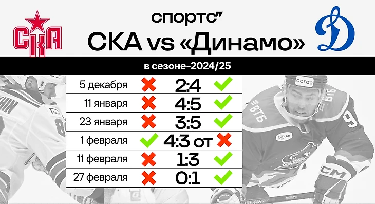 Символично, что это произошло в играх с московским «Динамо». СКА еще никогда столько раз не проигрывал одной команде в течение регулярки. До этого были только четыре проигрыша ЦСКА в сезоне-2019/20.