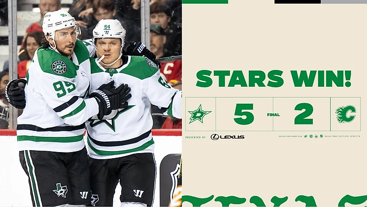 «Калгари Флэймз»-»Даллас Старз» 2:5. Руп Хинтц с Мэттом Люшеном и Микко Рантаненом набрали по 2 очка (1+1), Джейсон Робертсон и Мэйсон Марчмент отдали по 2 результативные передачи, Кейси ДеСмит отразил 46 бросков. У хозяев Назем Кадри забросил 2 шайбы. «Звёзды» выиграли 4 игру подряд.