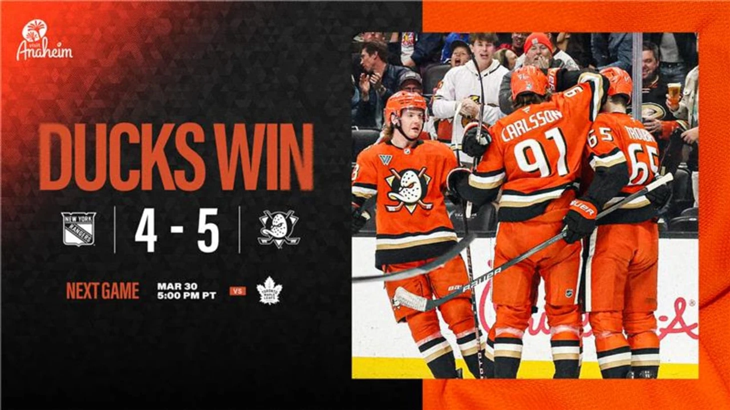«Анахайм Дакс»-»Нью-Йорк Рейнджерс» 5:4 (ОТ). Мэйсон МакТавиш в овертайме принёс победу хозяевам. Лео Карлссон набрал 4 очка (1+3), Каттер Готье и Олен Целлвегер набрали по 2 очка (1+1), Джейк ЛаКомб отдал 2 результативные передачи, Павел Минтюков отдал результативную передачу, Лукаш Достал отразил 26 бросков. У гостей Джей-Ти Миллер с Алексом Лафренье и Адамом Фоксом набрали по 2 очка (1+1), Артемий Панарин отдал 2 результативные передачи.